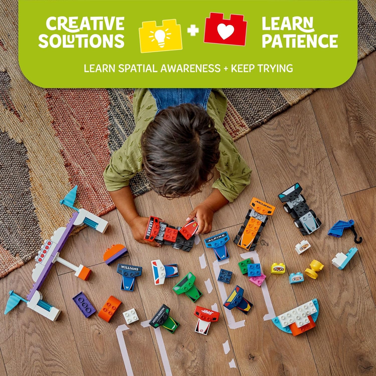 Start your engines and get ready to race with the F1 Team Race Cars & Drivers (10445) building toy. Boys and girls ages 2 and up get to experience the thrill of open wheel racing with this F1 LEGO set. This imaginative toddler car toy is packed with playful adventures, learning experiences, and interactive play. Little ones can create buildable LEGO F1 toy racing cars. Set also includes start lights and a podium. All 10 teams are represented, putting toddlers in the driver’s seat as they customize their cars and choose who wins the race and the trophy. This educational toddler toy helps kids to develop spatial awareness and practice fine motor skills using the crane toy’s lifting function to deliver a rapid pitstop. Inspire boys and girls to practice their color-sorting skills with this playset, as they identify teams with distinctive colors, and learn perseverance as they race against family members to determine who wins first place! Contains 70 pieces.