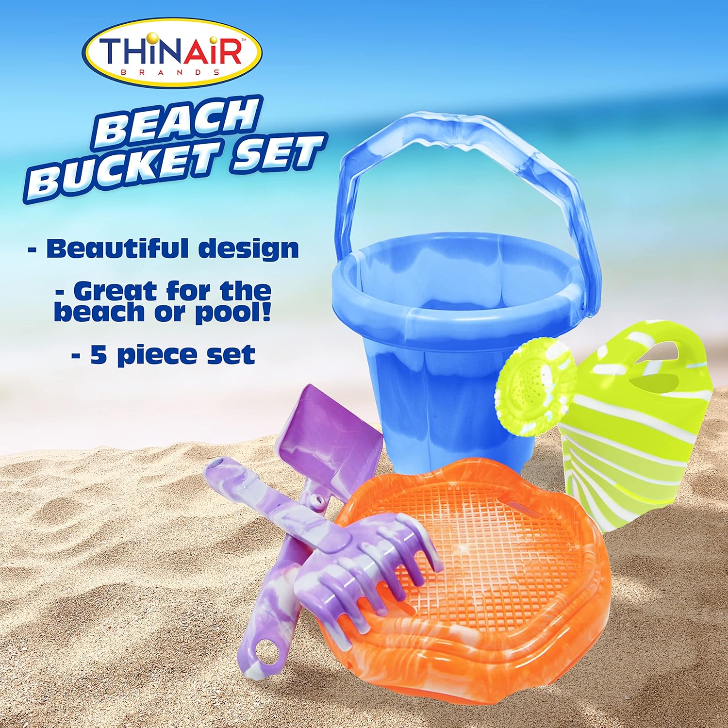 The ultimate beach bucket set for kids. High quality ABS plastic for durability and years of use. Includes bucket with handle, water pail, rake, shovel, and sifter.